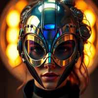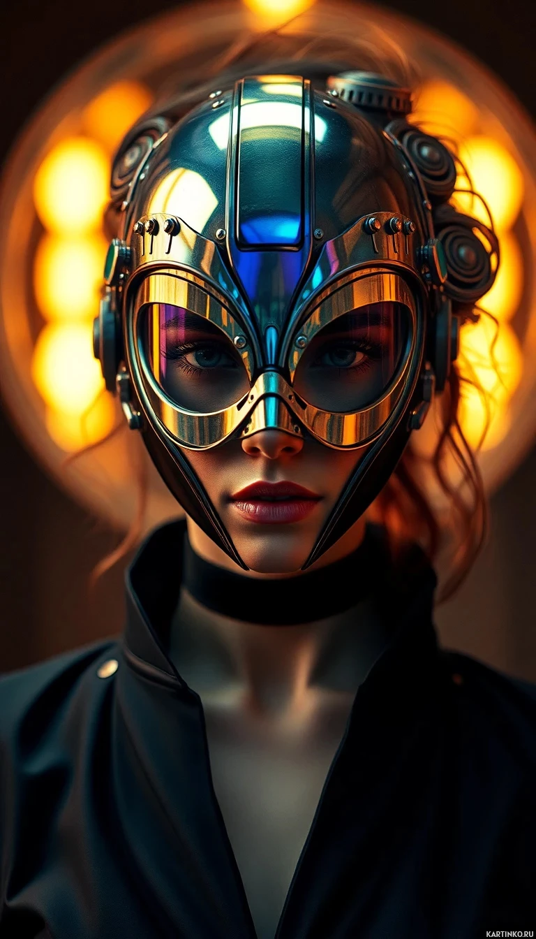 circle of light that appears to be coming from behind the woman's head. This could be a reflection off the helmet or a deliberate artistic choice to create a sense of depth and dimensionality in the image. Overall, the composition of the picture draws attention to the futuristic helmet and its sleek design, while also subtly highlighting the woman's features and expression.