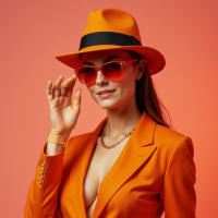 a young woman with long brown hair, dressed in an orange suit and accessories. She is wearing a fedora-style hat with a black band around it, which adds