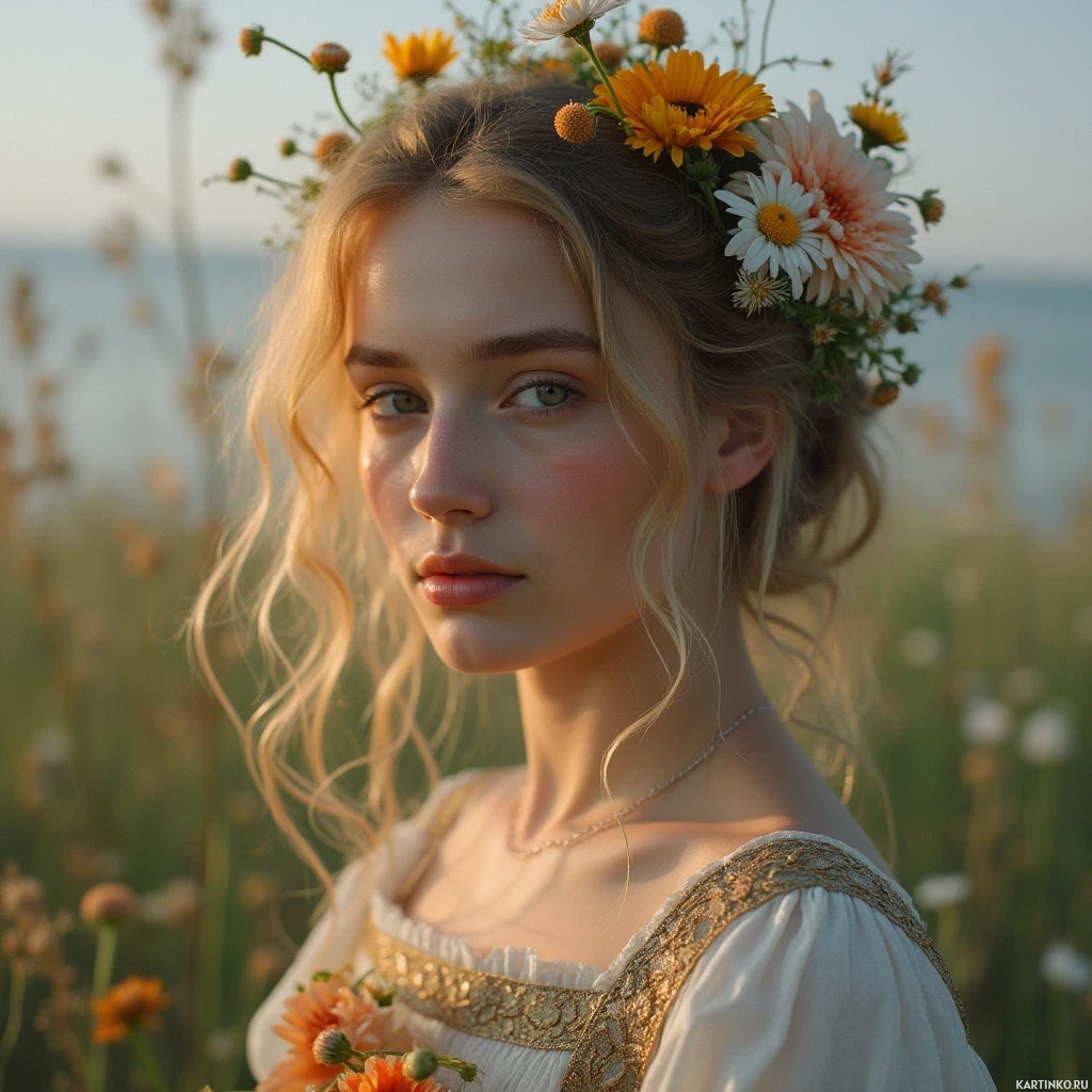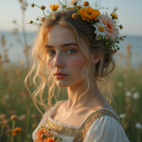 a white dress with gold trim on the bodice and has a bouquet of flowers in her right hand. The background of the image is out of focus, but it appears to be a field or meadow with wildflowers. The overall atmosphere of the image is one of serenity and beauty. The woman's