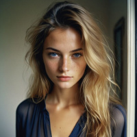 На картинке молодая женщина позирует в интерьере, слегка опираясь на дверную раму. У нее длинные светлые волосы и она одета в черную кружевную комбинацию с открытыми плечами. Ее выражение лица нейтральное, голова слегка наклонена.