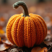 a vibrant orange knitted pumpkin, crafted from thick and chunky yarn. The pumpkin is adorned with a green stem that adds