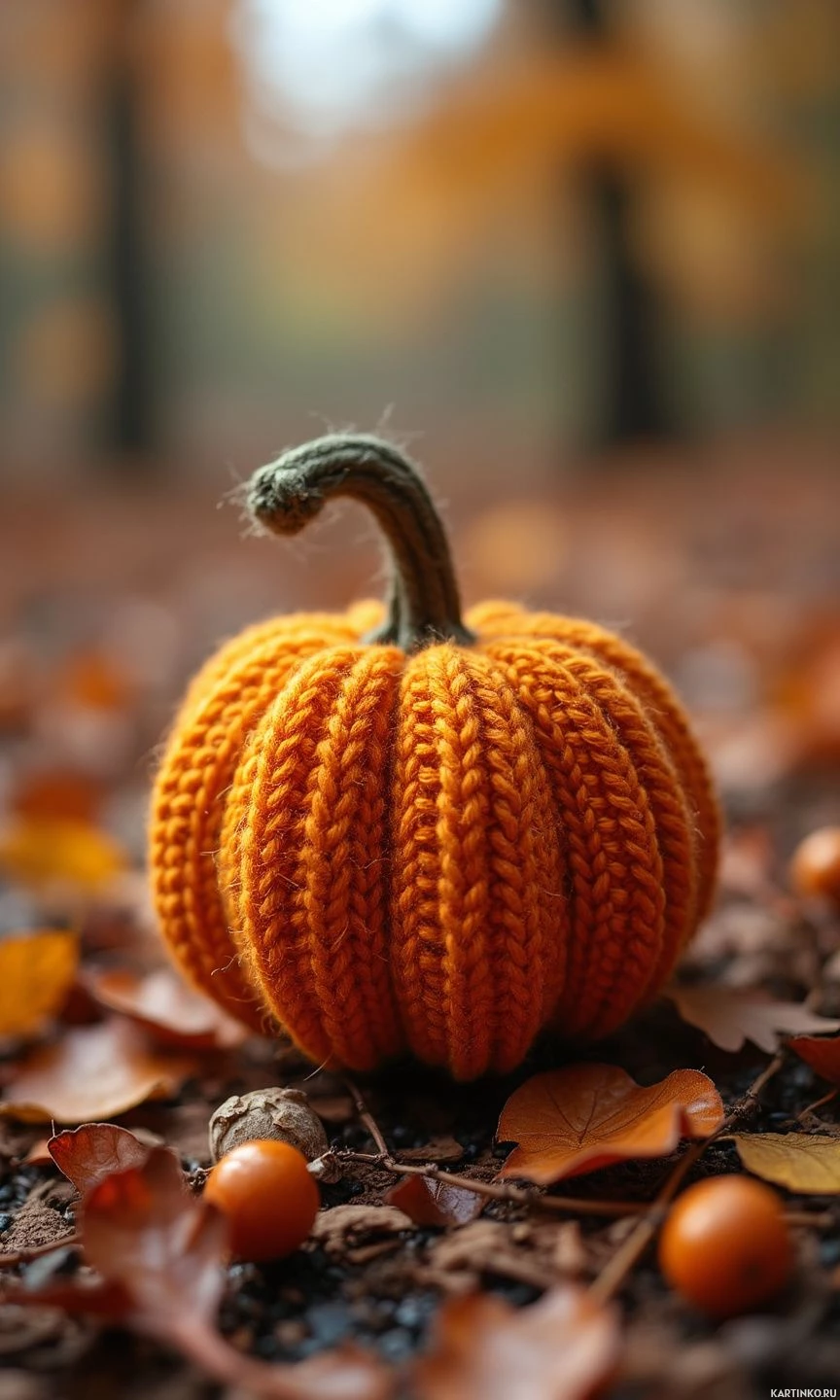 knitting project or collection. The background of the image is blurred, but it appears to feature a fall-themed setting, complete with