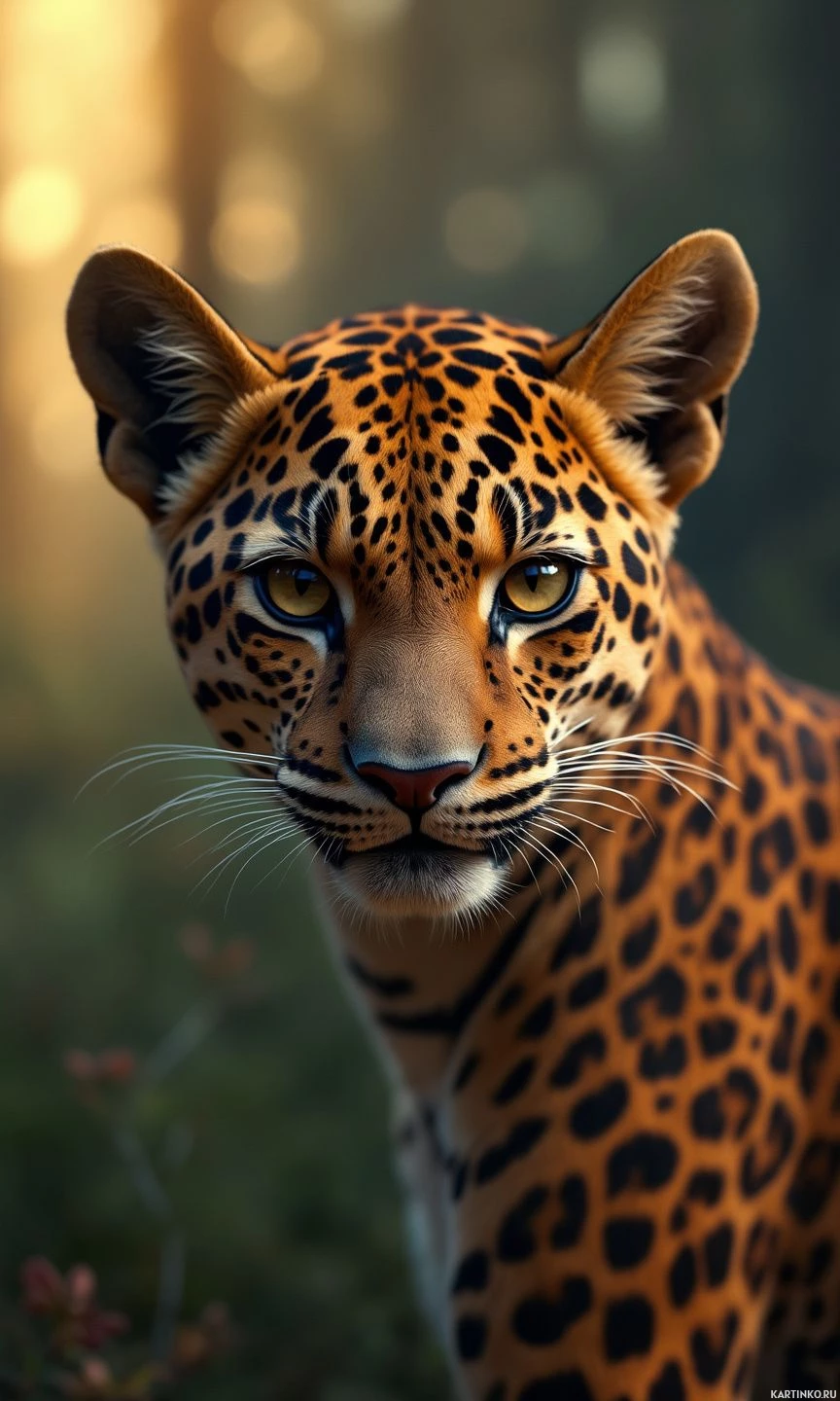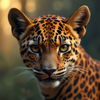 a natural setting, possibly a forest or savannah. Overall, the image provides a striking portrait of a leopard in its