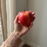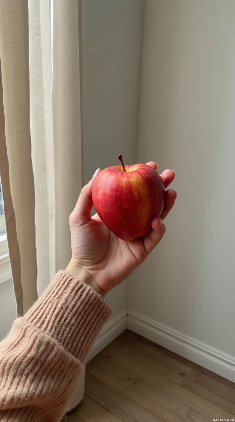 The image depicts a woman holding an apple in her hand. The woman's right arm is visible, and she is wearing