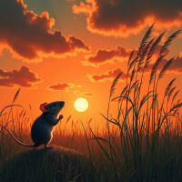 natural beauty and tranquility. Overall, the image captures a peaceful moment in time, with the mouse seemingly lost in thought as it gazes up at the sky during the golden hour of sunset.