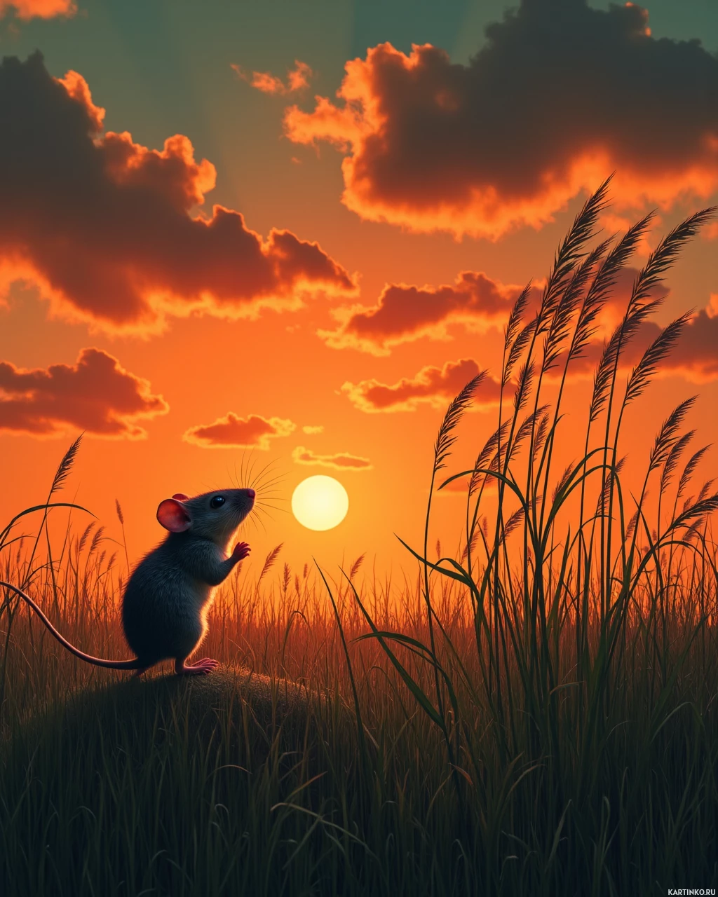 Dark clouds gather in the distance, adding depth and texture to the scene. Tall grasses or reeds surround the mouse, creating a sense of