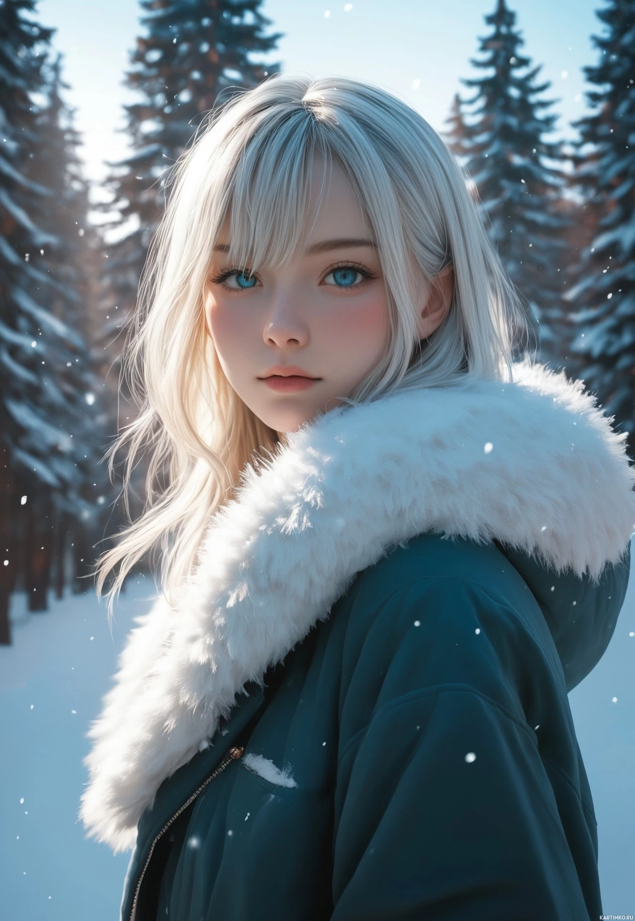 white hair and piercing blue eyes, dressed in a teal jacket adorned with a faux fur trim around her neck. The girl's gaze is directed towards the viewer, her attention seemingly focused on something beyond the frame. In the background, towering pine trees stand tall against a backdrop of snow-covered ground and sky, evoking a sense of