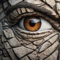 view of an eye, characterized by its distinctive features and textures. The iris is predominantly brown with lighter shades around the edges, while the pupil appears black. The eyelid surrounding the eye exhibits a wrinkled texture, giving it a unique appearance. A