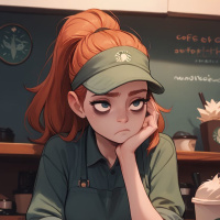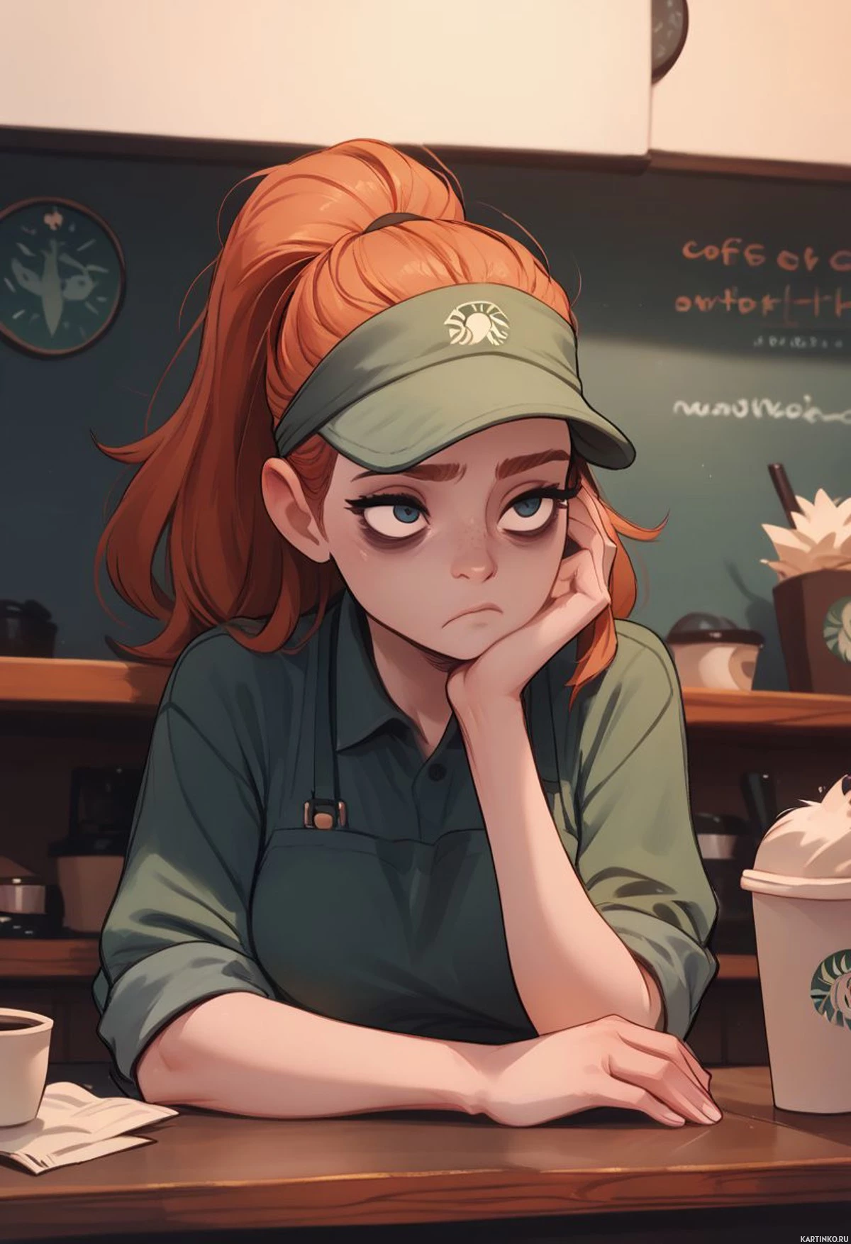 a contemplative pose, resting her chin on her hand as she sits at a counter. The girl is wearing a uniform that suggests she works at