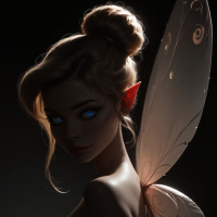 rosy cheeks and lips painted a deep pink color. A sprinkle of glittering silver dust on her cheeks adds to her ethereal beauty. In the background, a subtle gradient of light and shadow creates depth and dimensionality. The overall effect is one of enchantment and fantasy, capturing the essence of Tinker Bell's magical nature.