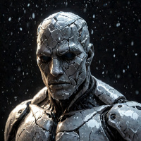 a humanoid robot with a cracked, metallic surface. The robot's head is tilted slightly to the left, and its eyes are dark and empty. Its body is composed of large, irregularly shaped pieces of metal that appear to be welded together. The robot's arms are not visible in this image. It appears that the artist used photo editing software to create a realistic