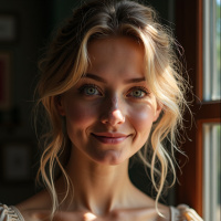 a sense of depth and dimensionality to the image. Overall, the image presents a serene and peaceful atmosphere, with the woman's smile and the soft lighting creating a warm and inviting ambiance.