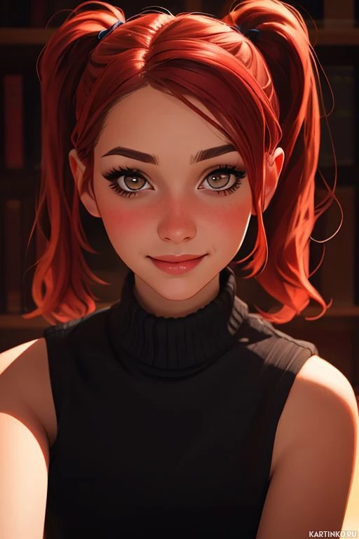 expressive eyes and is wearing makeup that includes highlighted cheeks and lips. Her hair is styled in two ponytails on either side of her head. She is depicted wearing a dark top with