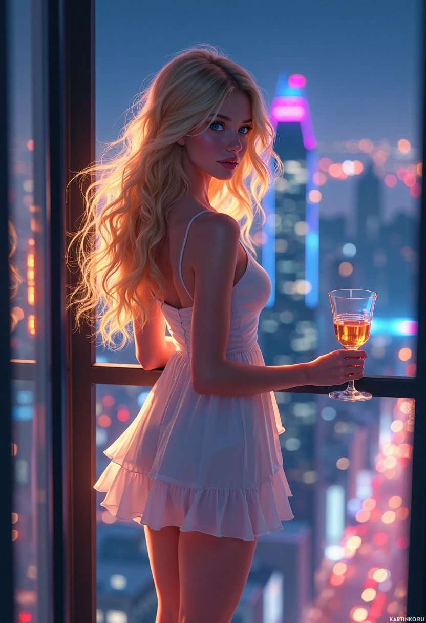 an elevated balcony or patio, holding a glass of champagne in her right hand. The woman's gaze is directed towards the viewer, and she appears to be enjoying the view from the balcony. In the background, there are several