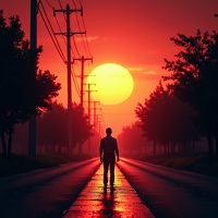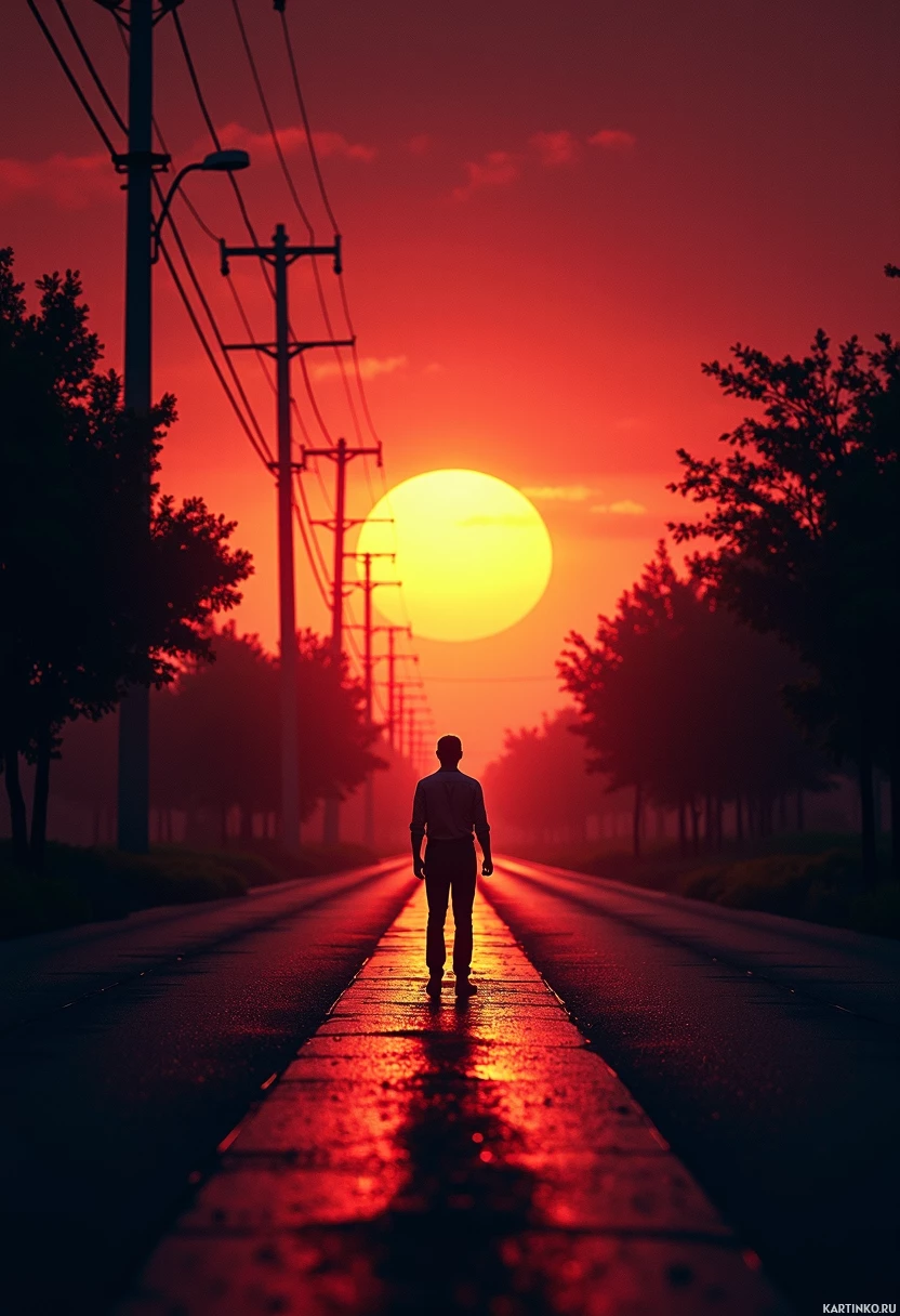 the bright sunlight behind him. In the foreground, the road stretches out before the man, lined with trees on either side. The sun is setting directly behind him, casting