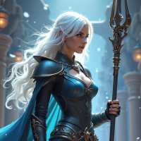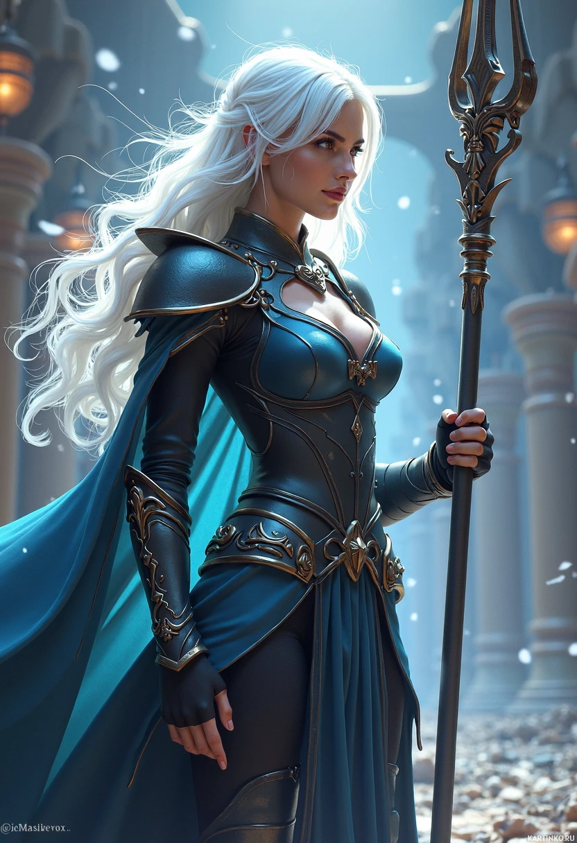 white hair wearing a cloak and holding a staff. The woman is dressed in a blue leather