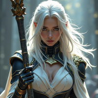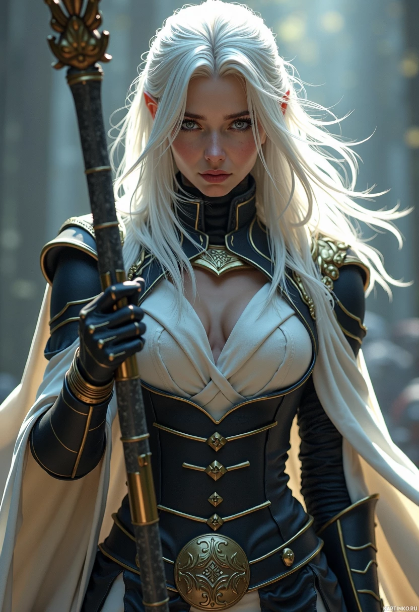 gold accents and a high collar, paired with matching gauntlets on her arms. * Her armor is intricately designed, featuring curved lines and floral patterns that evoke a sense of elegance and sophistication. * A flowing white cape hangs from her shoulders, billowing behind her like a cloud as she moves. * In her right hand, the elf woman grasps a staff adorned with intricate carvings and gemstones. * The staff appears to be made of dark wood or stone, its surface etched with symbols that seem to pulse with a soft blue light. * At the top of the staff, a large crystal or gemstone glows brightly, casting an ethereal aura around the elf woman. * The background of the image is blurred, but it appears to be a misty forest or mountainous landscape, with towering trees and rocky outcroppings visible in the distance. * The atmosphere is one of mystique and wonder, as if the elf woman has stepped into a realm beyond our own. Overall, the image presents a captivating and enchanting portrait of an elf woman, exuding an air of mystery and otherworldliness.