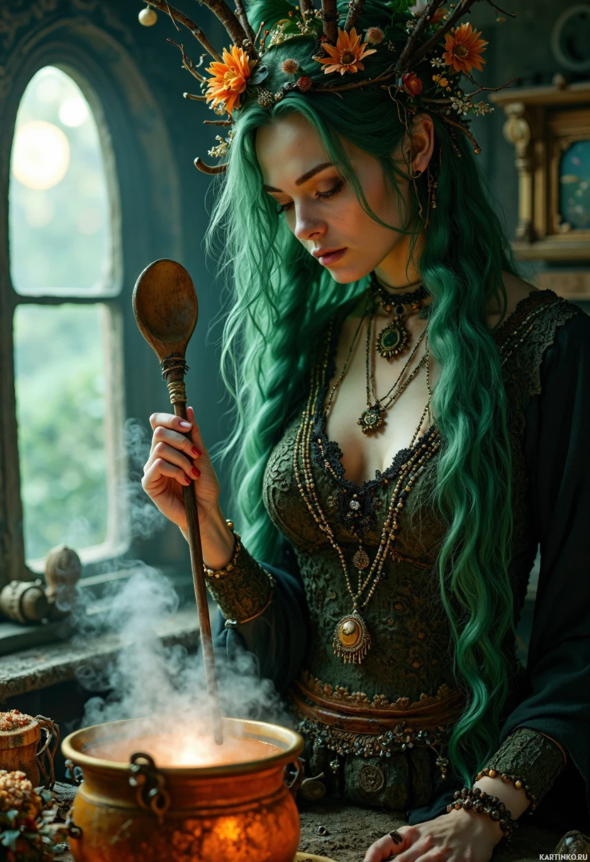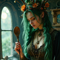 natural light to filter in. On the right side of the room, there is a tall, ornate mirror with a gold frame. The overall atmosphere of the image suggests that the woman is engaged in some sort of ritualistic or magical activity, possibly involving cooking or brewing potions. The use of natural elements such as flowers and branches on her headpiece adds to this impression, while the presence of a candle and book/parchment on the table implies that she may be seeking guidance or enlightenment through her actions.