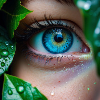 green leaves surrounding it. The eye is looking directly at the camera, and the eyelashes are long and dark. The iris is a bright