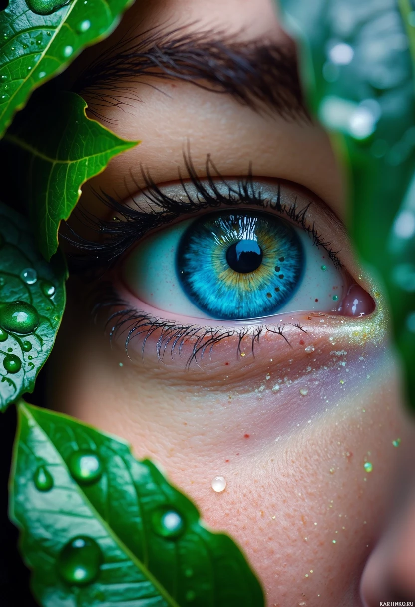 freckles on the skin around the eye. The green leaves are placed around the eye, creating