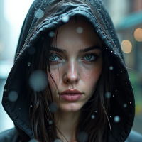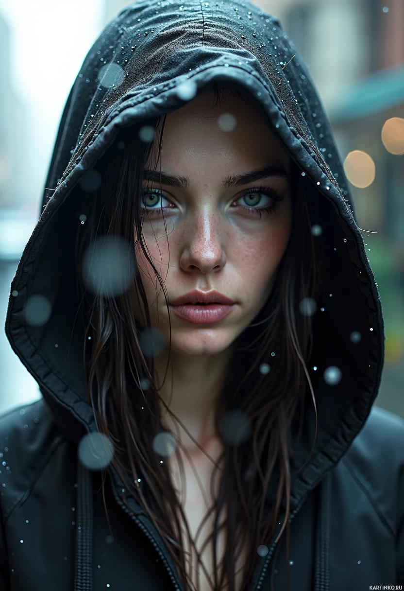a young woman with long, dark brown hair and green eyes, wearing a black hooded jacket. The hood is up, and her face is partially obscured by it. She has fair skin and full lips. Her hair is wet and slightly disheveled, suggesting that she may have been caught in the rain or engaged in some other