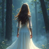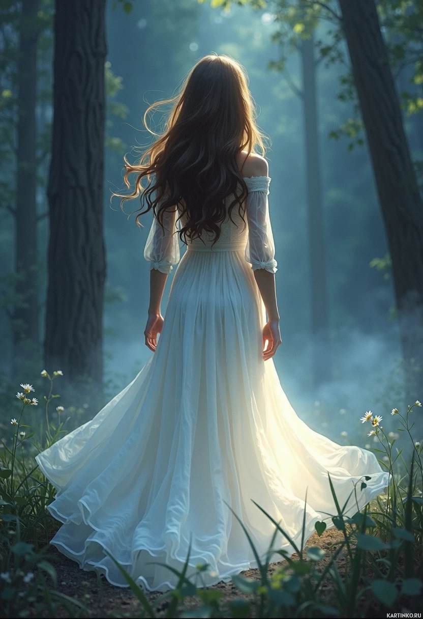 the forest floor, their delicate petals swaying gently in the breeze. The overall atmosphere of the image exudes a sense of peace and tranquility, inviting the viewer to step into this idyllic setting. The woman's graceful movements and the soft light filtering through the trees create a captivating visual experience.