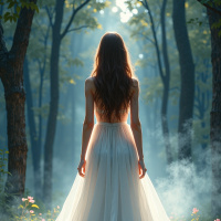 a young woman standing in a forest, her long brown hair cascading down her back as she gazes out into the distance. She is dressed in a flowing
