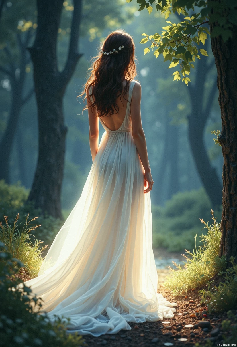 a young woman, dressed in a flowing white gown, standing with her back to the viewer. Her long, dark