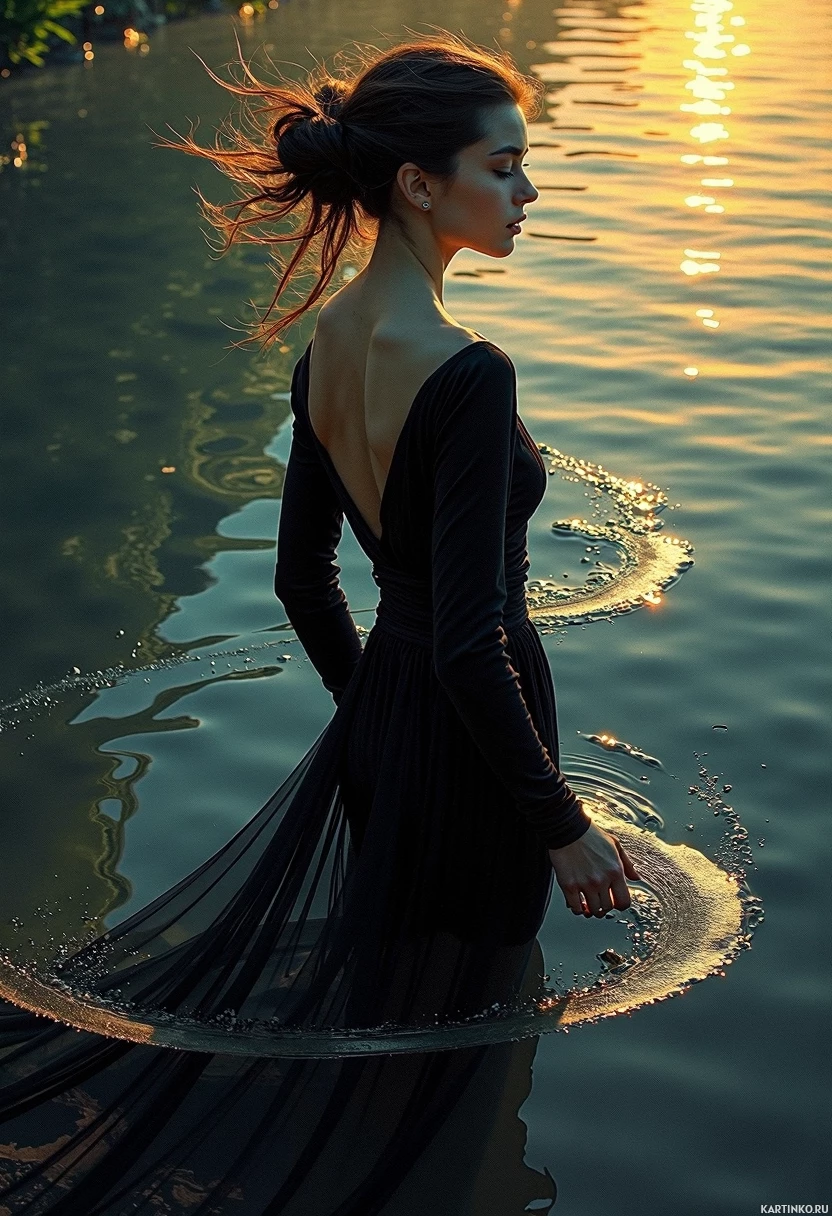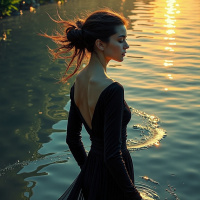 a sense of introspection or meditation. The water surrounding her appears calm and peaceful, with