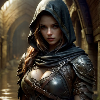 brown hair elegantly braided and cascading down her back. She wears a black leather hood over her head, which is pulled up to conceal her face, while a silver circlet adorns her forehead. A flowing