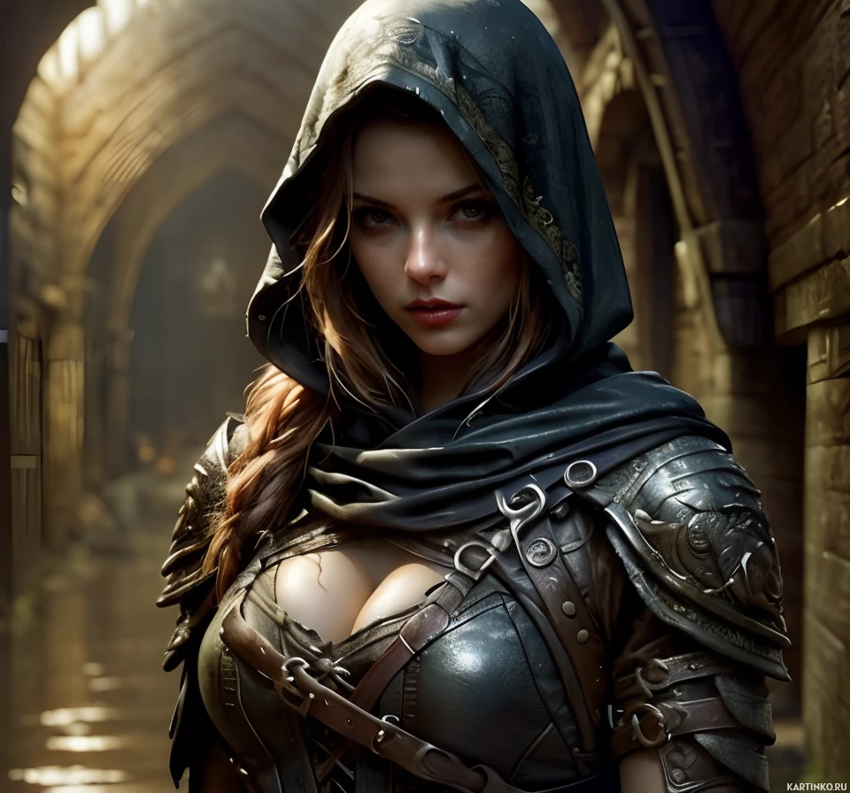 blue eyes radiating a sense of intensity and focus. Her lips are pursed, as if she is concentrating on something or someone beyond the horizon. The background of the image is blurred, but it appears to be a medieval-style castle with stone walls and towers, adding to the overall atmosphere of mystery and intrigue. Overall, the woman's attire and demeanor suggest that she is a skilled warrior or adventurer, ready to face whatever challenges lie ahead with courage and determination.