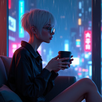neon lights visible through the window behind her. The overall atmosphere of the image suggests that the woman is enjoying