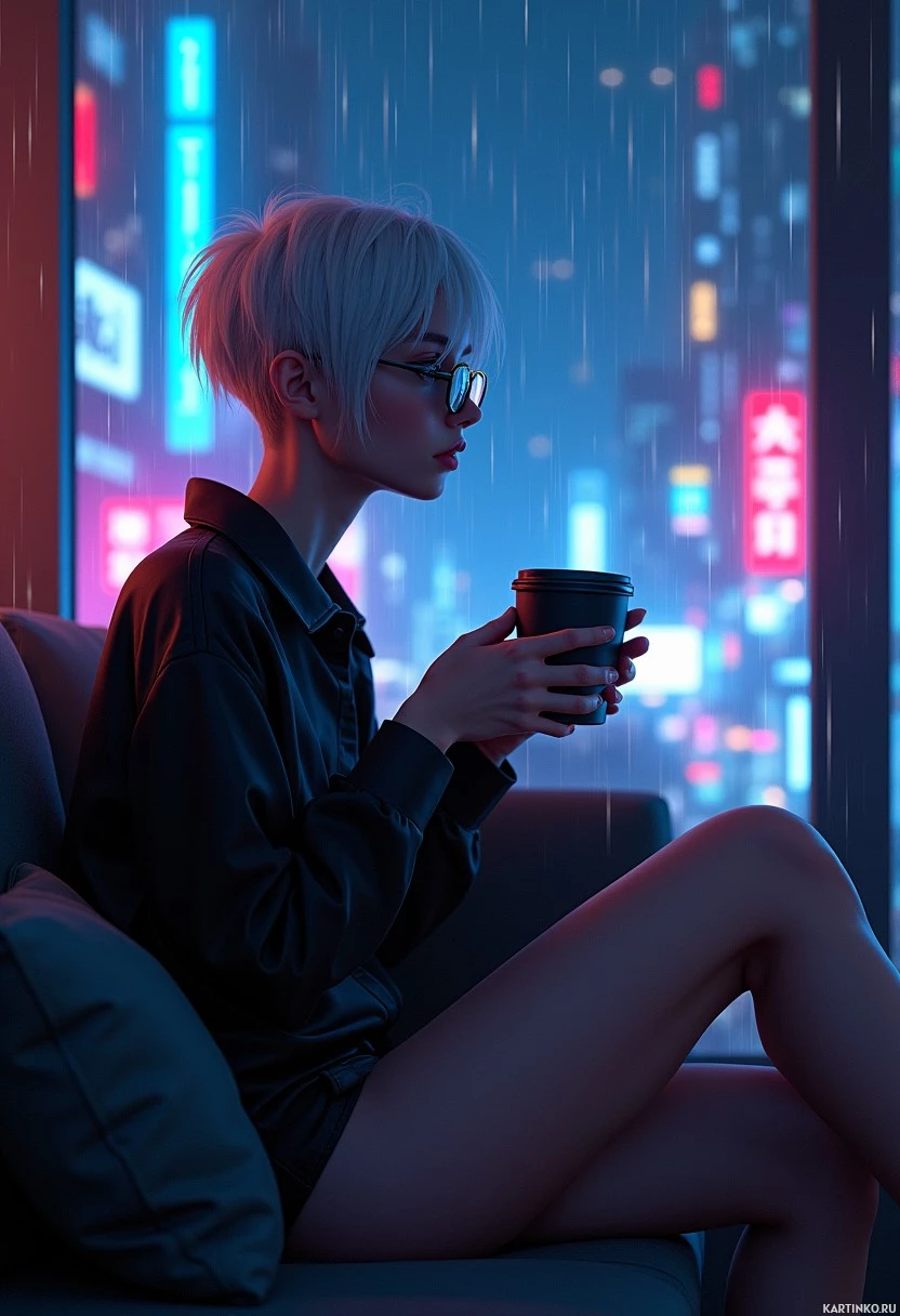 a young woman with short, white hair and glasses sitting on a couch or chair, holding a cup in her hands. She is wearing a black