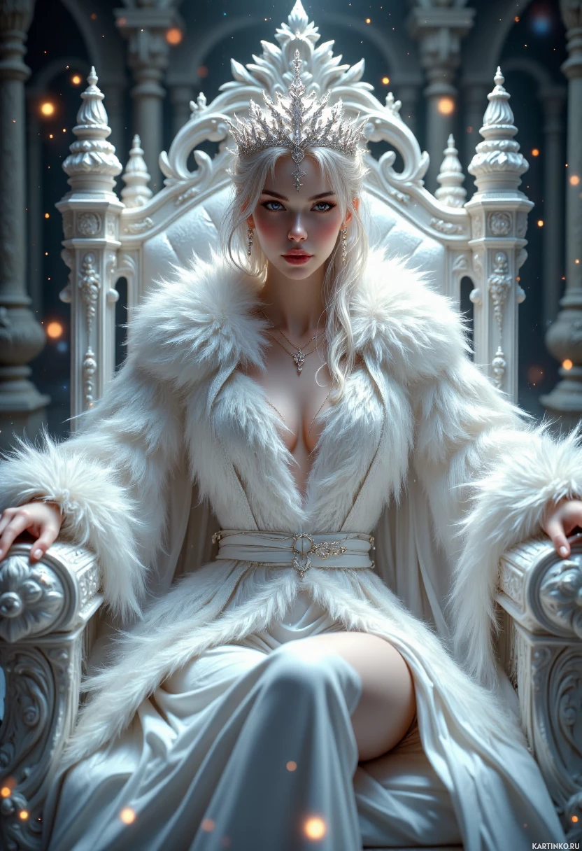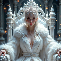 white hair, adorned in an intricately designed crown that sits atop her head. She is seated upon a throne, which appears to be made of a luxurious material such as velvet or silk, and features