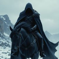 the sense of adventure and danger that pervades the image. The overall atmosphere is one of mystery and intrigue, inviting the viewer to wonder about the identity and purpose of the rider and their journey.