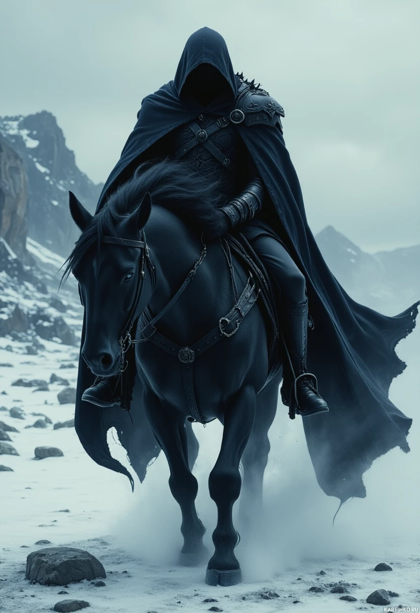 a hooded figure riding a horse through a snowy landscape. The rider is dressed in