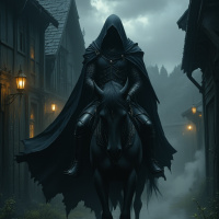 dark attire, with their face obscured by the hood of their cloak. They are mounted on