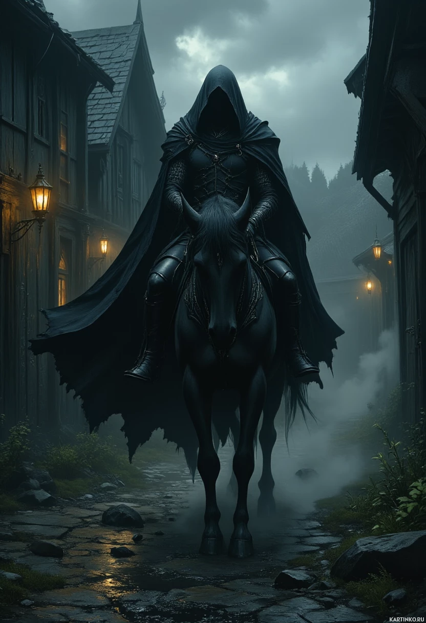 a hooded figure riding a horse down a cobblestone street, surrounded by buildings and illuminated by lanterns. The rider is dressed in