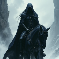 a hooded figure riding a horse, clad in dark attire and cloaked in mystery. The rider is attired in black leather armor, complete with a flowing cloak that billows behind them as they gallop through