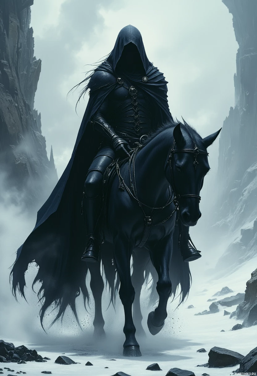 covered ground, leaving behind only faint impressions in the pristine white expanse. The background of the image is dominated by towering rock formations that rise up like sentinels on either side of the path ahead. These imposing monoliths cast long shadows across the snow below them, adding to the overall sense of drama and tension present within this scene. Overall, the image presents a haunting and evocative portrayal of a hooded figure riding a horse through a desolate winter landscape. The combination of dark colors, rugged terrain, and the ominous presence of the rider creates an atmosphere that is both captivating and unsettling, drawing the viewer in with its sense of mystery and foreboding.