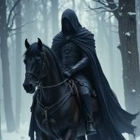 quiet contemplation, as if the rider is lost in thought as they traverse the frozen terrain. The overall mood of the image is somber and introspective, inviting the viewer to ponder the story behind this enigmatic scene. The contrast between the dark colors of the rider's attire and the snow-covered landscape creates a striking visual effect, drawing attention to the solitary figure on horseback. The absence of any other signs of life in the forest adds to the sense of isolation, making the rider seem like a lone wanderer in a desolate world. Despite the somber tone, there is something hauntingly beautiful about this image. The way the snow clings to the horse's legs and the rider's armor creates a sense of texture and depth, while the hooded figure remains an intriguing enigma, shrouded in mystery. As the viewer gazes upon this frozen tableau, they cannot help but wonder what secrets lie hidden beneath the surface, waiting to be uncovered.