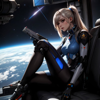 outer space. Her expression is serious, suggesting that she is focused or determined. The