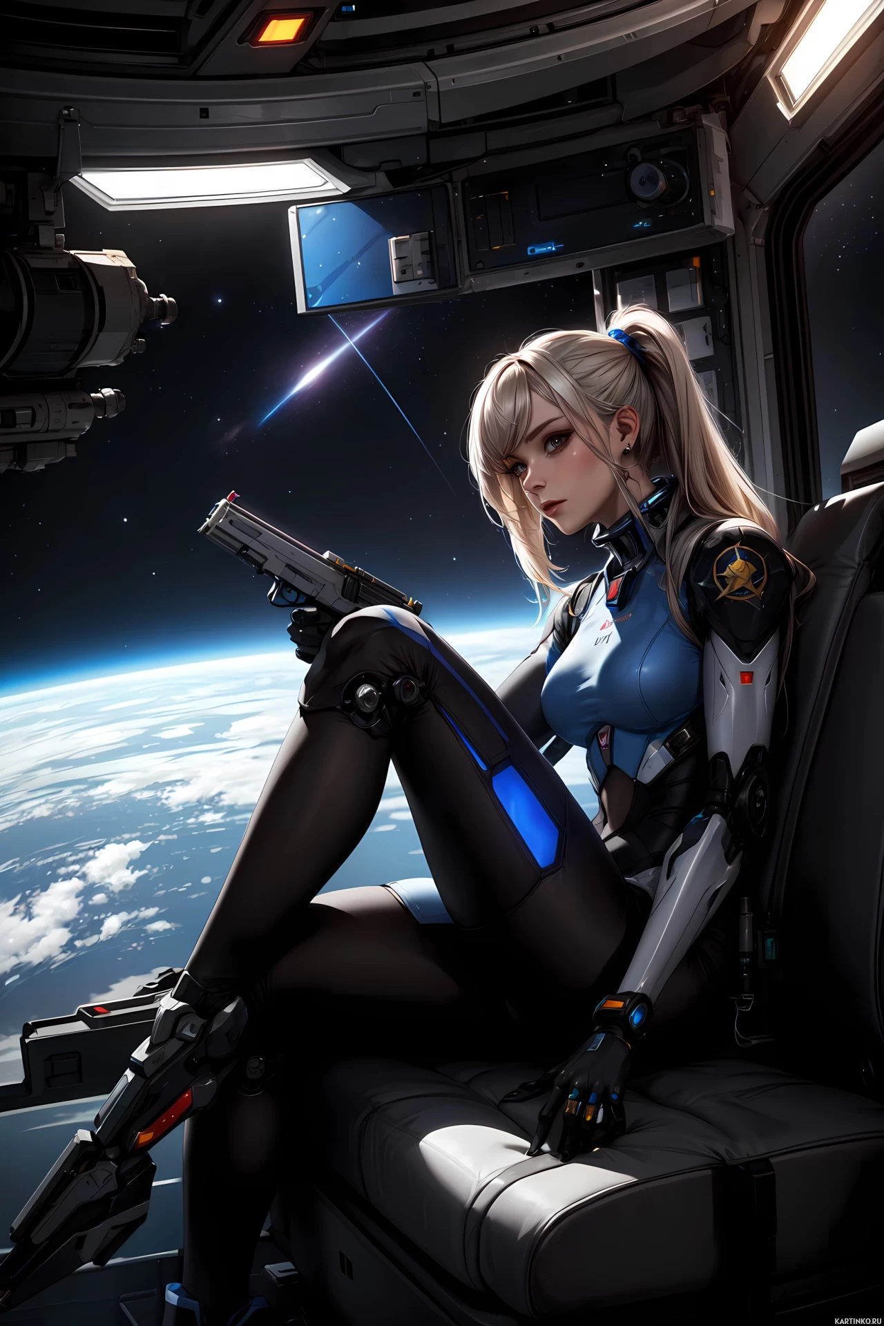 a female character with blonde hair wearing a black and blue bodysuit with futuristic design elements. She has a pistol in her right hand, and she appears to be sitting in the cockpit of a spacecraft, which is set against the backdrop of
