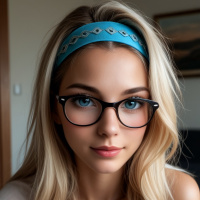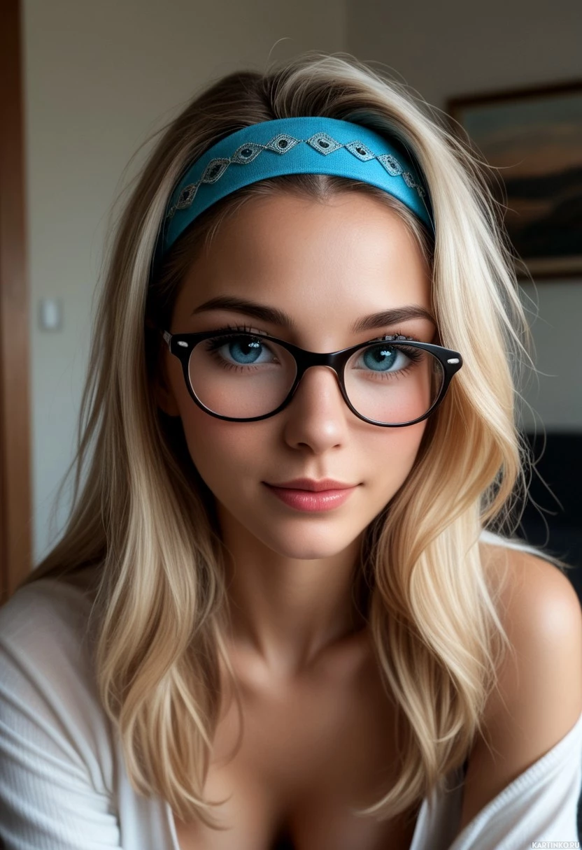 The image depicts a young woman with long blonde hair, wearing a blue headband and black-framed glasses. She has fair skin and is looking directly at the camera with a neutral expression. The background of the image is out of focus but appears to be a room with white walls and a doorway or window on the left side.
