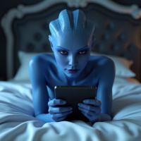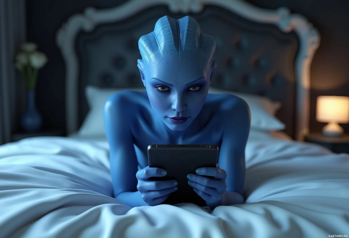 alien woman lying on her stomach in bed, intently gazing at a tablet. She has distinctive