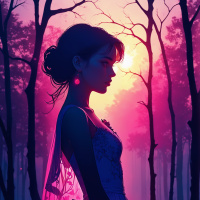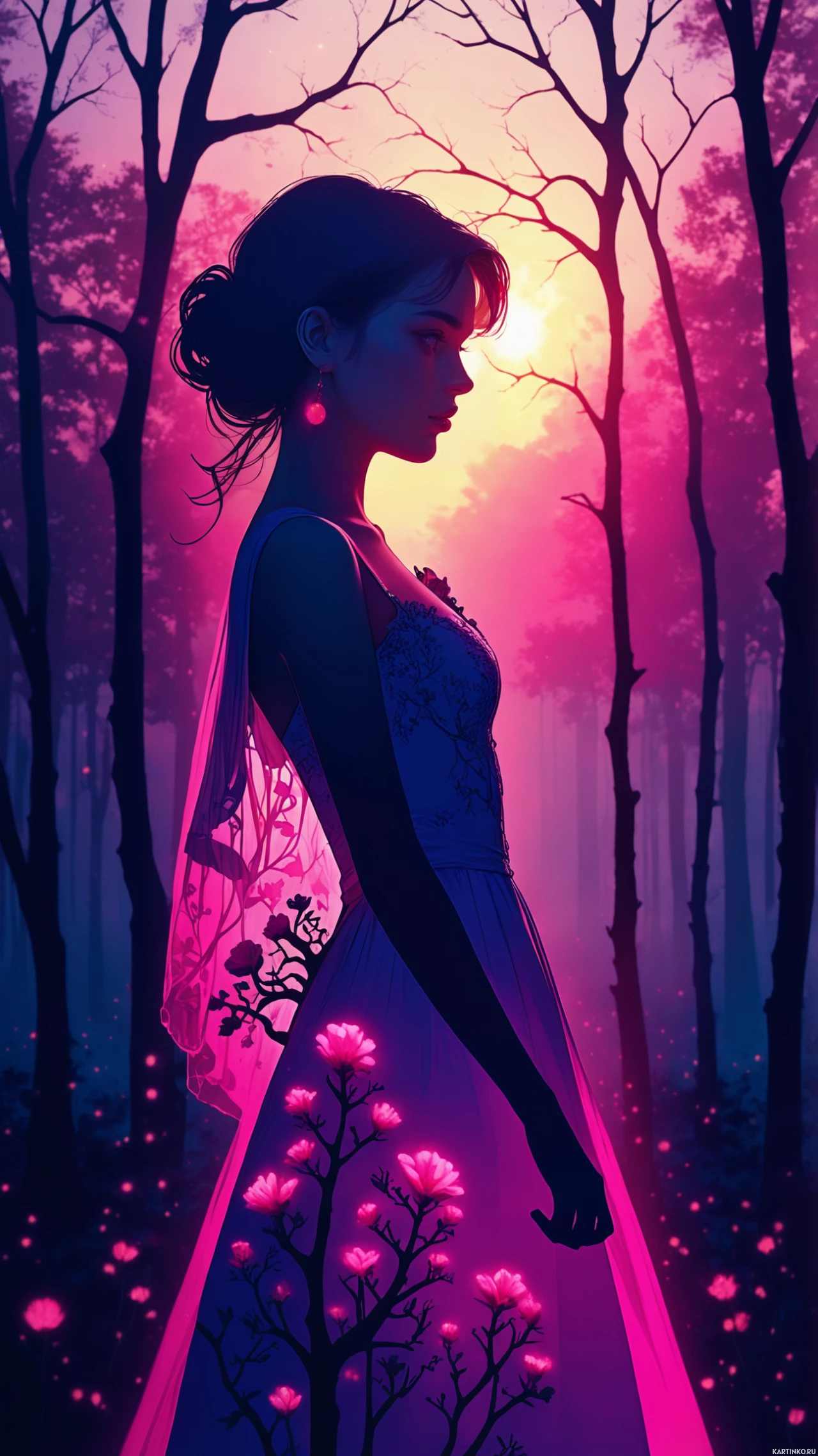 a soft glow over the entire scene. The woman stands amidst this serene backdrop, her face turned slightly away from the viewer as she gazes into the distance. The overall atmosphere of the image exudes peace and tranquility, inviting the viewer to step into the idyllic world depicted within.