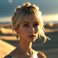 a young woman with blonde hair, styled in a messy bun and wispy bangs. Her