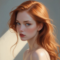 subtle smile plays on her lips, adding a hint of warmth to her expression. In terms of composition, the image is set against a plain white background, which serves to highlight the subject's features and create a sense of simplicity and elegance. The overall effect is one of understated sophistication, as if the woman is posing for an artist's study or a formal portrait. Overall, this photograph presents a captivating and intimate portrayal of a young woman with striking red hair and piercing blue eyes, exuding a sense of quiet confidence and poise.