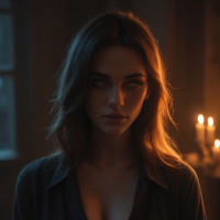 brown hair and a black top. She is illuminated by candlelight, which casts
