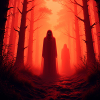 a dense forest, shrouded in an ominous red mist. The atmosphere is foreboding and unsettling, with the figures' silhouettes cast against the backdrop of